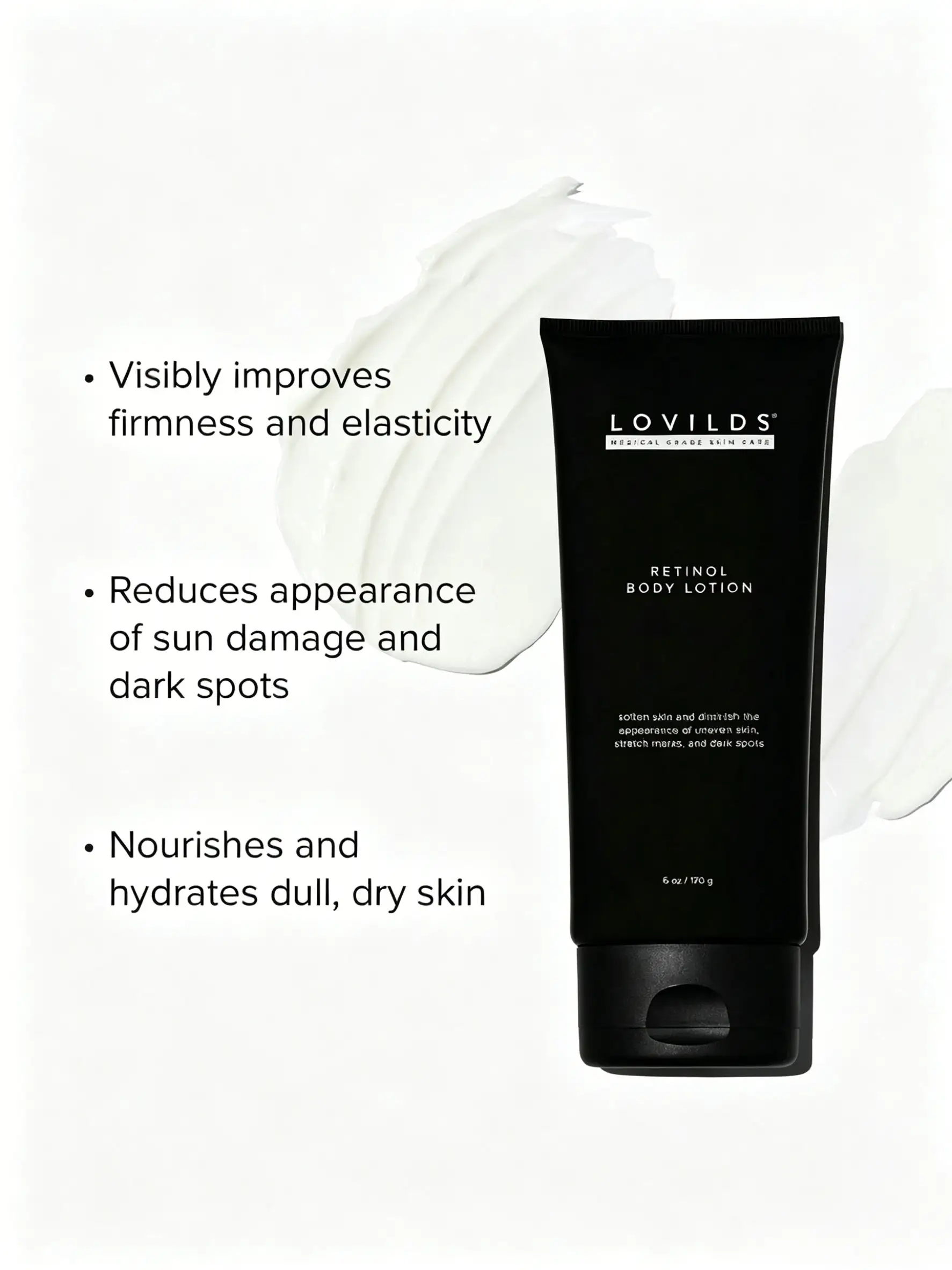 LOVILDS Retinol Body Lotion brings the same active ingredient your face routine relies on — retinol — to the rest of your skin. With shea butter and ceramides for deep hydration, and a non-irritating formula gentle enough for daily use.