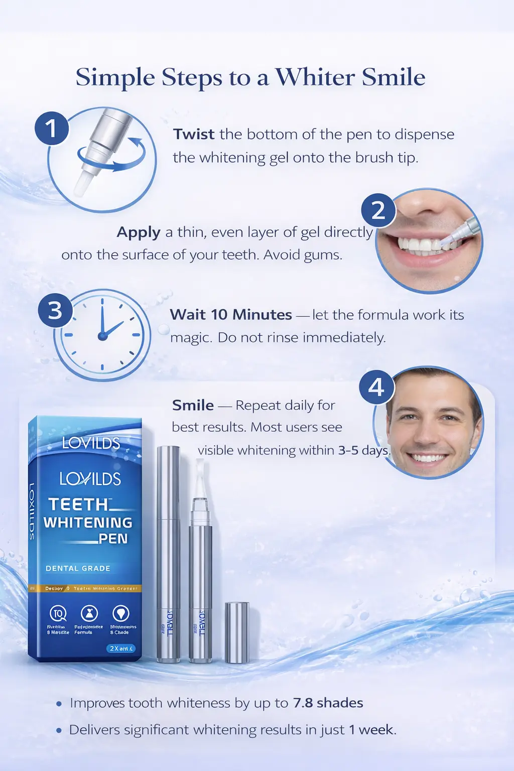 The LOVILDS teeth whitening pen uses a high-concentration whitening formula of 35% CP (hydrogen peroxide), which has been clinically proven to safely break down surface pigments on teeth and remove coffee, tea and cigarette stains.